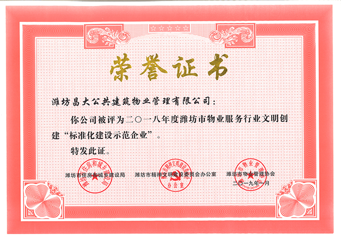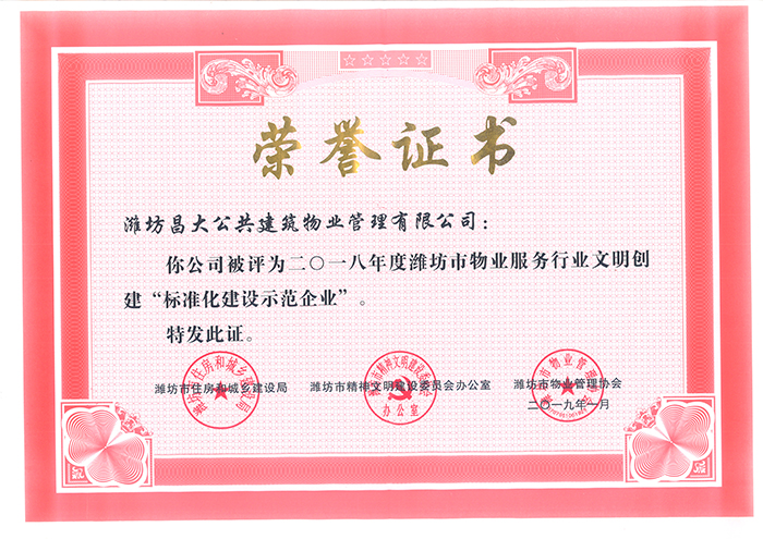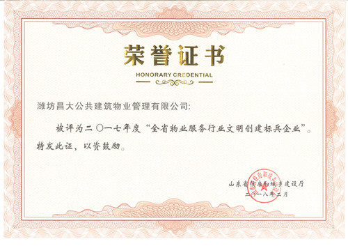2018年2月被評為全省物業(yè)行業(yè)文明創(chuàng)建標兵企業(yè)