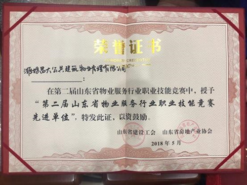 2018年5月被評為第二屆山東省物業(yè)服務行業(yè)職業(yè)技能競賽現(xiàn)進單位