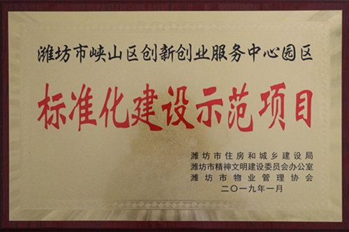 2019年1月濰坊市峽山區(qū)創(chuàng)新創(chuàng)業(yè)服務中心園區(qū)物業(yè)管理項目被評為“標準化建設示范項目”