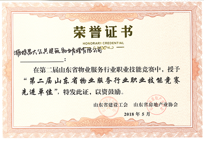 2018年5月被評為第二屆山東省物業(yè)服務行業(yè)職業(yè)技能競賽現(xiàn)進單位
